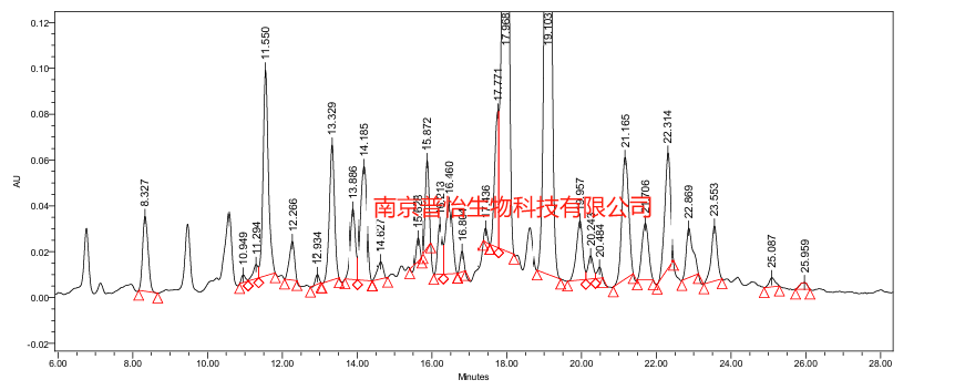 色譜圖黃酮色譜峰加以標(biāo)識(shí),共計(jì)標(biāo)識(shí)出29個(gè)黃酮類色譜峰 從放大圖中可以看出,該部分仍有5個(gè)非黃酮類化合物,但從峰 面積及峰高判斷,該類化合物占比很小。